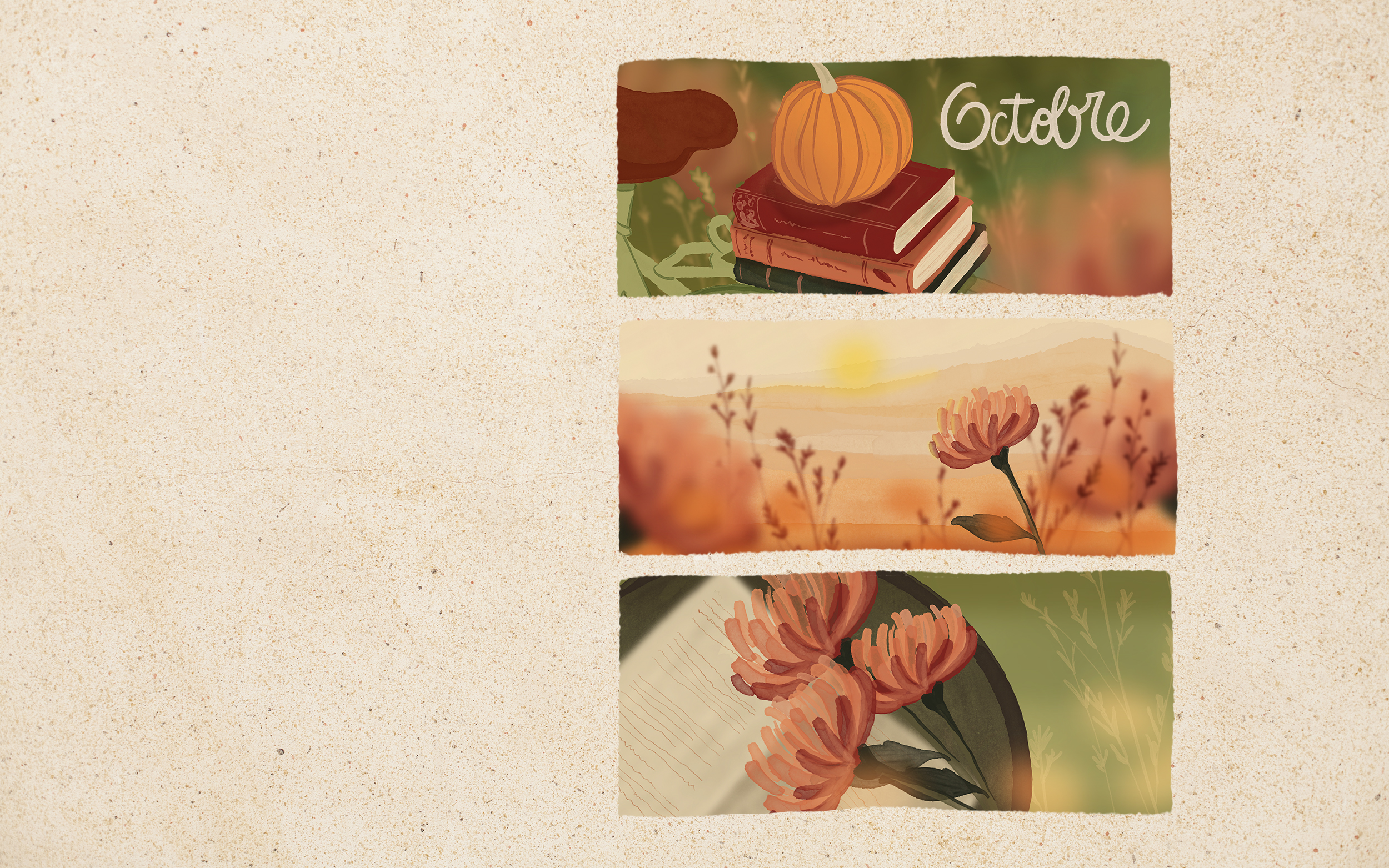 Ma saison préférée est enfin arrivée et ton nouveau fond d’écran pour le mois d’octobre aussi ! Je ne sais pas si ça se ressent dans ce fond, mais je suis souvent plus inspirée par cette saison. Les couleurs changent, du vert on passe au jaune, puis à l’orange avant d’arriver vers des teintes rouges. J’ai toujours trouvé cette palette réconfortante, même si elle ne dure pas longtemps.